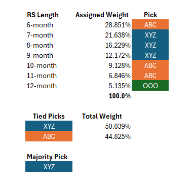 In the example below ABC and XYZ are tied, each the pick of 3 RS Lengths. On a tiebreak, the majority pick is XYZ, as the weights assigned to the RS lengths that picked XYZ total 50.039% versus 44.825% for the RS lengths that picked ABC.