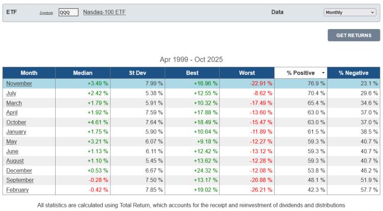 QQQ has also been positive more frequently in November than any other month, though it is also the month with the highest standard deviation.
