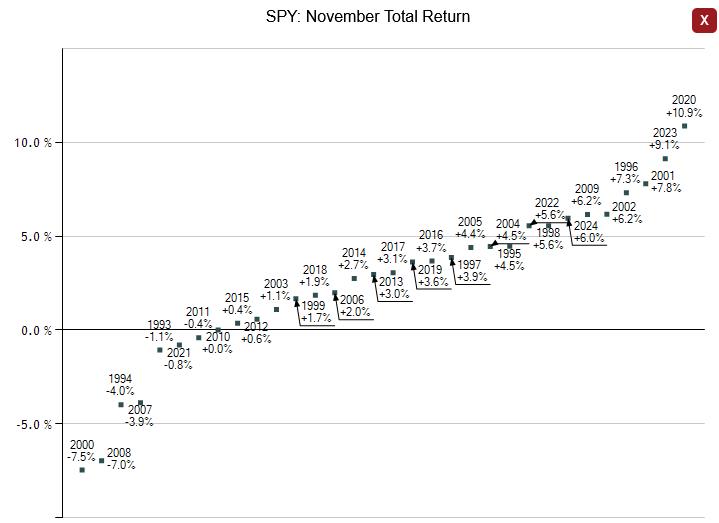 Its best November return so far has been +10.9% in 2020 and its worst -7.5% in 2000. 2021 was the last time it posted a negative return in November (-0.8%).