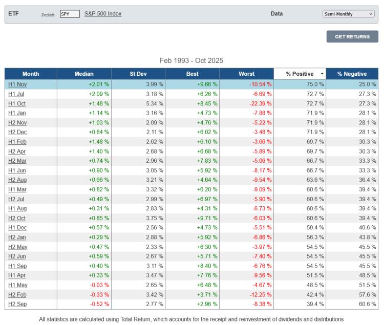 The first half of November has historically been stronger than the second half of the month for SPY; its median return for the first half of November is +2% and it’s been positive 75% of the time versus a median return of +1% with 71.9% positive for the second half.