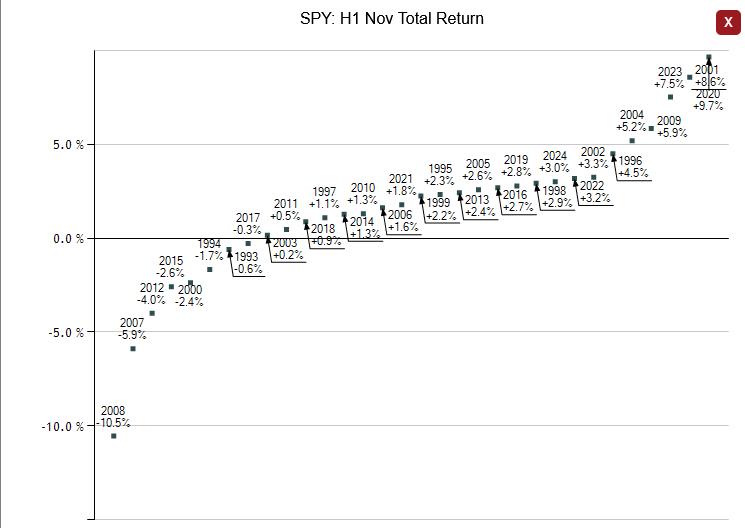 The first half of November has historically been stronger than the second half of the month for SPY; its median return for the first half of November is +2% and it’s been positive 75% of the time versus a median return of +1% with 71.9% positive for the second half.