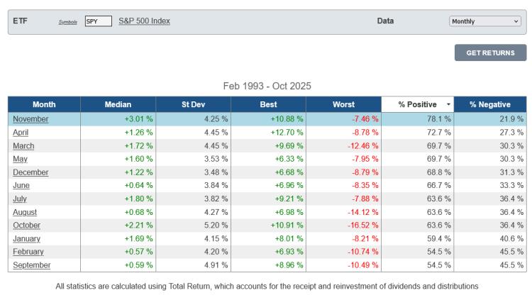 SPY returns have been positive more frequently in November than any other month of the year. Since its inception, SPY has produced a median return of 3% in November and been positive 78% of the time.